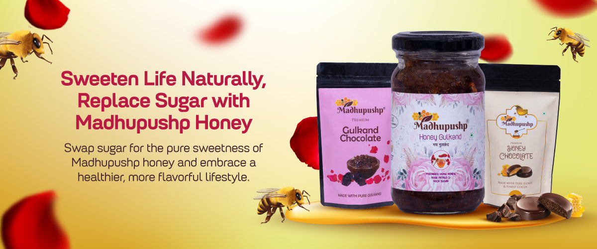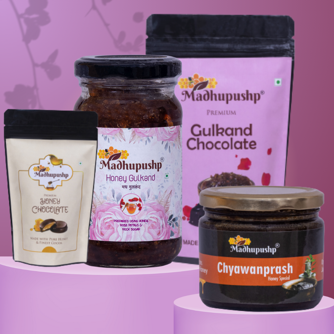 Delight in Madhupushp Honey Delicious treats: heavenly chocolate, fragrant gulkand, and revitalizing chyavanprash. Taste the essence of nature's blissful flavors.