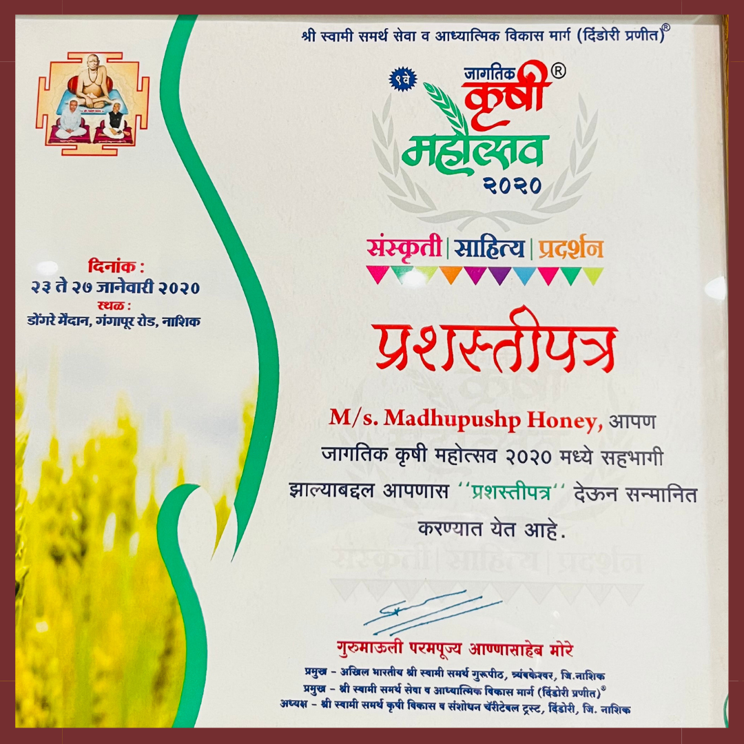 Madhupushp Honey has been honored with the esteemed 'Best Participant' award at the prestigious 'Jagtik Krushi Mahotsav' held in Nashik. This global agricultural extravaganza brings together the finest minds and organizations in the industry, making this recognition all the more significant.