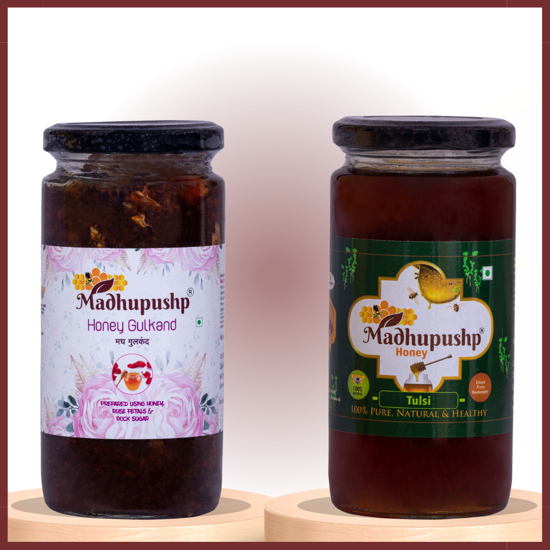 - Indulge in the delightful combination of two exquisite flavors with the Madhupushp Honey combo of Honey Gulkand & Tulsi Honey.