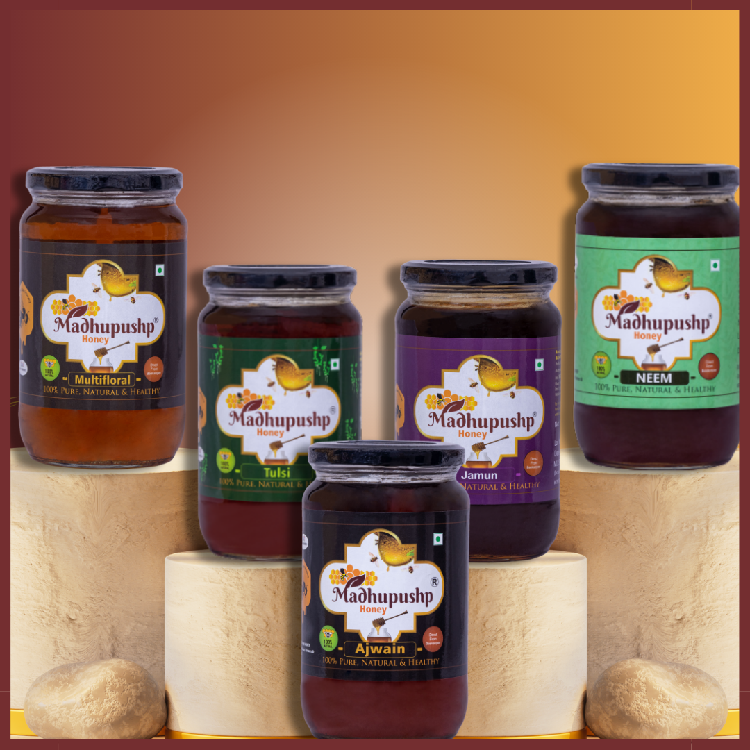 Indulge in this delectable assortment, and experience the goodness of nature's finest honey varieties, thoughtfully curated by Madhupushp Honey. Discover a world of flavors and wellness in each jar!